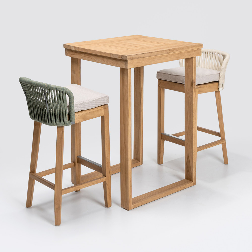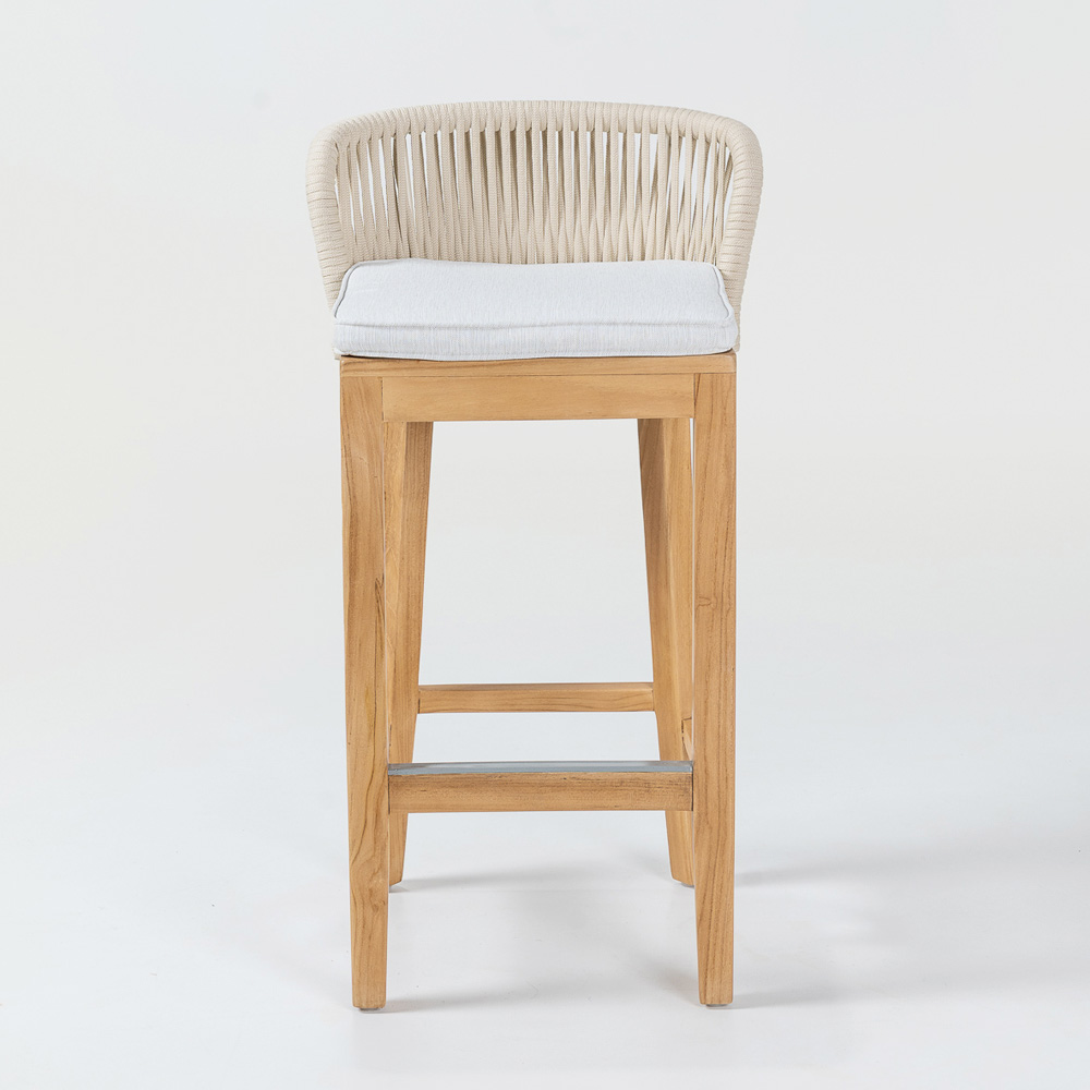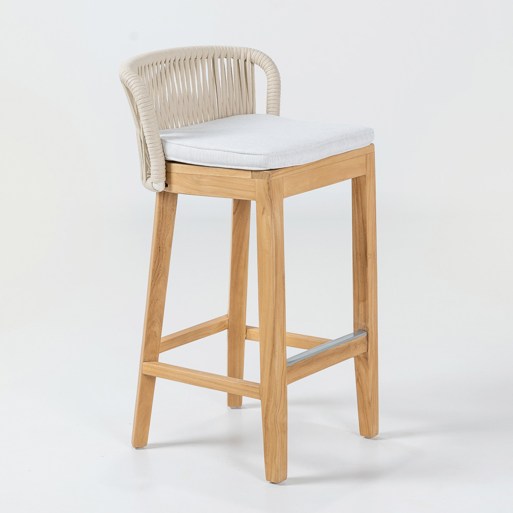 Élégant et polyvalent, ce tabouret de bar est doté d'une structure en teck naturel et aluminium , alliant robustesse et légèreté . Son coussin en tissu gris Havana offre un confort optimal, tandis que son tressage en corde oléfine/PP apporte une touche de sophistication tout en étant résistant aux intempéries, ce qui le rend idéal pour une utilisation intérieure et extérieure.