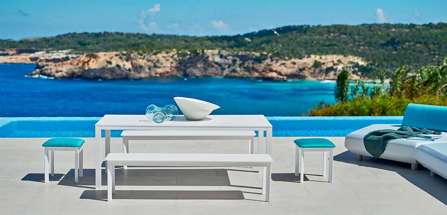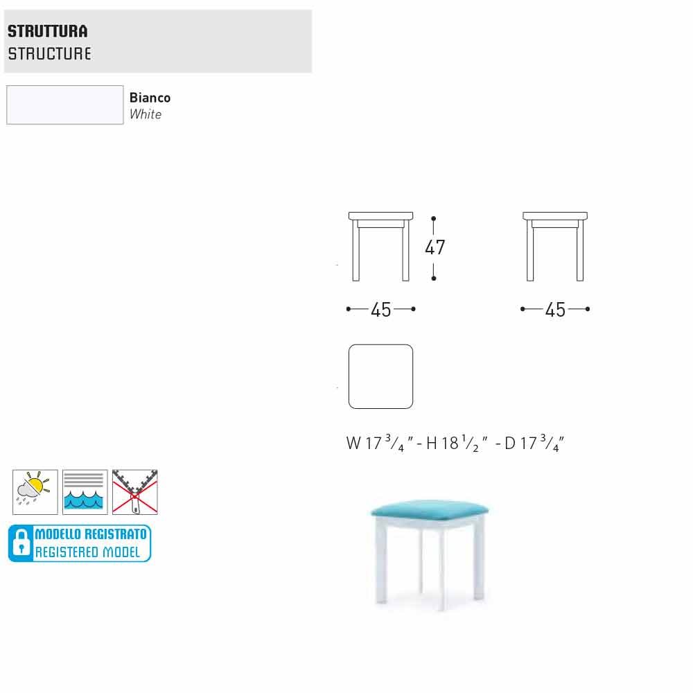 Le système est un tabouret d'extérieur enchanteur avec une structure en aluminium peinte en poudre blanche avec siège rembourré en tissu disponible en différentes variantes de tissu. Grâce à sa polyvalence et à son design contemporain, il conviendra parfaitement aux aménagements extérieurs tels que les terrasses, les piscines, les jardins; mais il trouve un placement parfait également à l'intérieur, dans le salon.