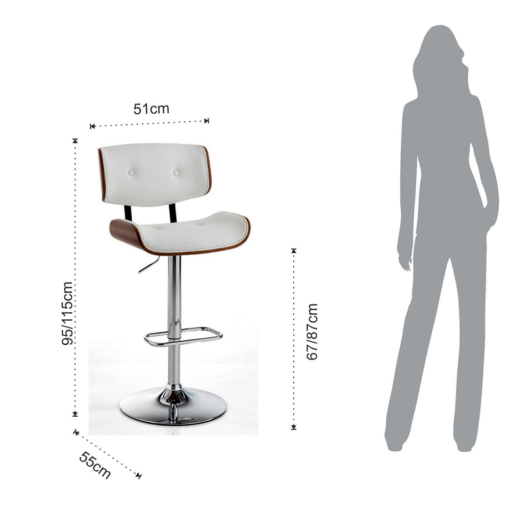 Tabouret de cuisine haut avec base en métal chromé avec repose-pieds pratique et assise et dossier en contreplaqué teinté noyer et cuir synthétique blanc. Sa particularité est représentée par le vérin à gaz réglable et pratique qui vous permet de personnaliser la hauteur d'assise jusqu'à un maximum de 87 cm. Son design est unique et captivant et est ponctué de formes douces et de lignes arrondies qui assurent un tabouret confortable et accueillant, donc idéal pour compléter les environnements domestiques tels que les cuisines ou les salles à manger mais aussi les bars et restaurants de style moderne. La merveilleuse combinaison de la touche imposante du bois et de l'élégance intemporelle du cuir donne vie à un complément original et avant-gardiste avec une forte personnalité contemporaine .