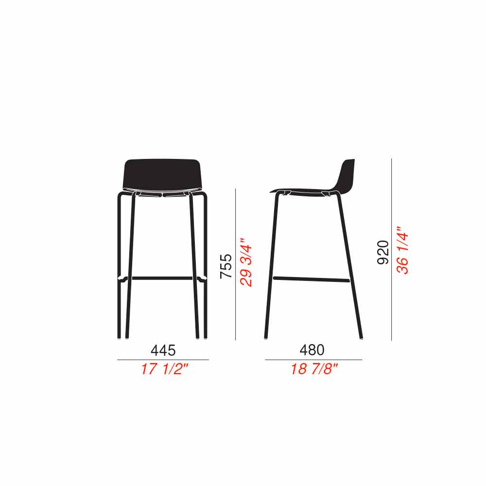 2 tabourets en métal et polypropylène avec dossier empilable Fabriqué en Italie.