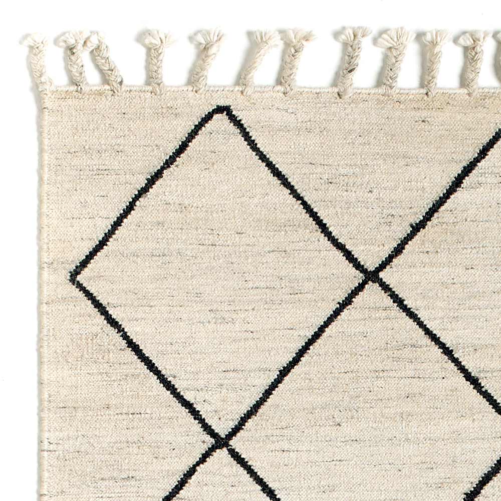 géométrique dans les tons de noir qui donne de la modernité ainsi que les franges qui recouvrent les deux côtés les plus courts du tapis. Les matériaux et les techniques utilisés permettent d'obtenir un produit final de haute qualité capable d'attirer l'attention sur lui-même, rendant chaque environnement unique.