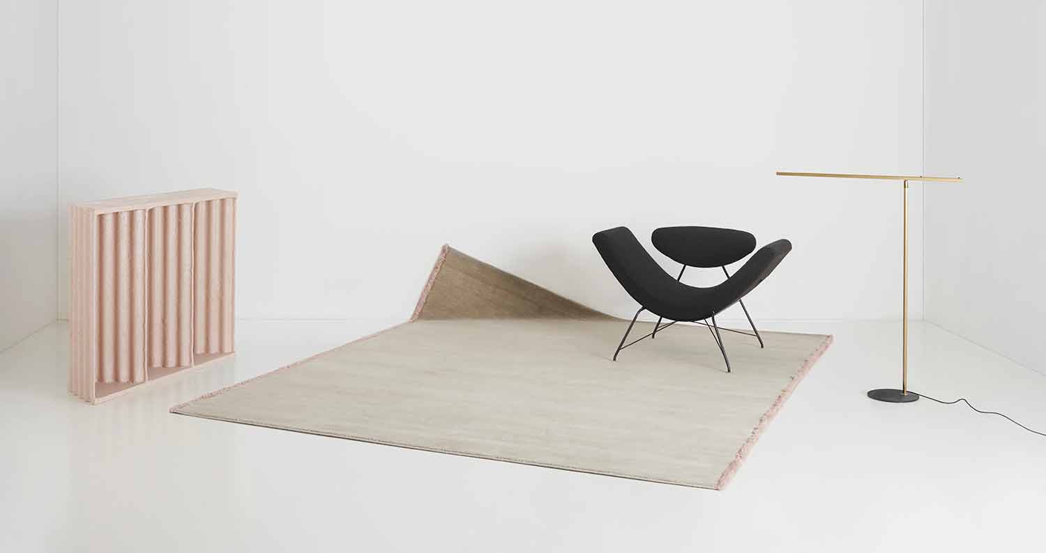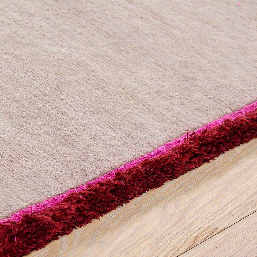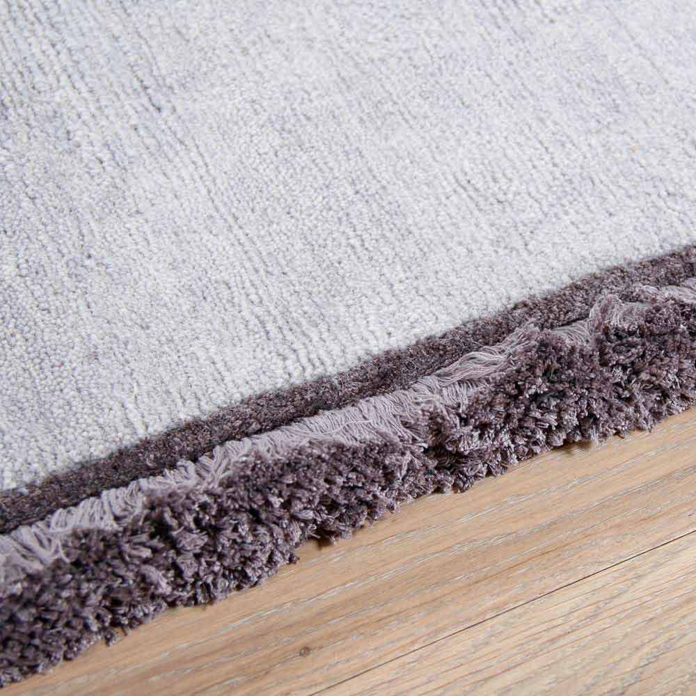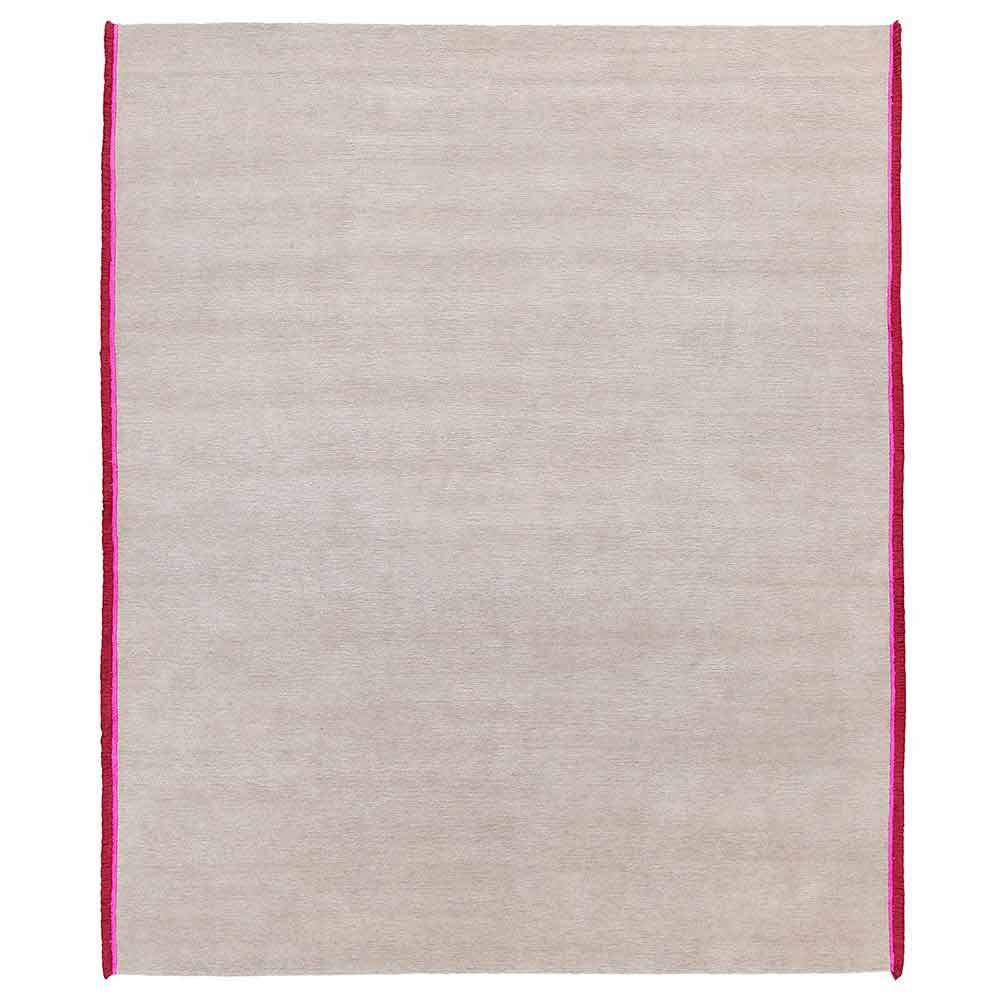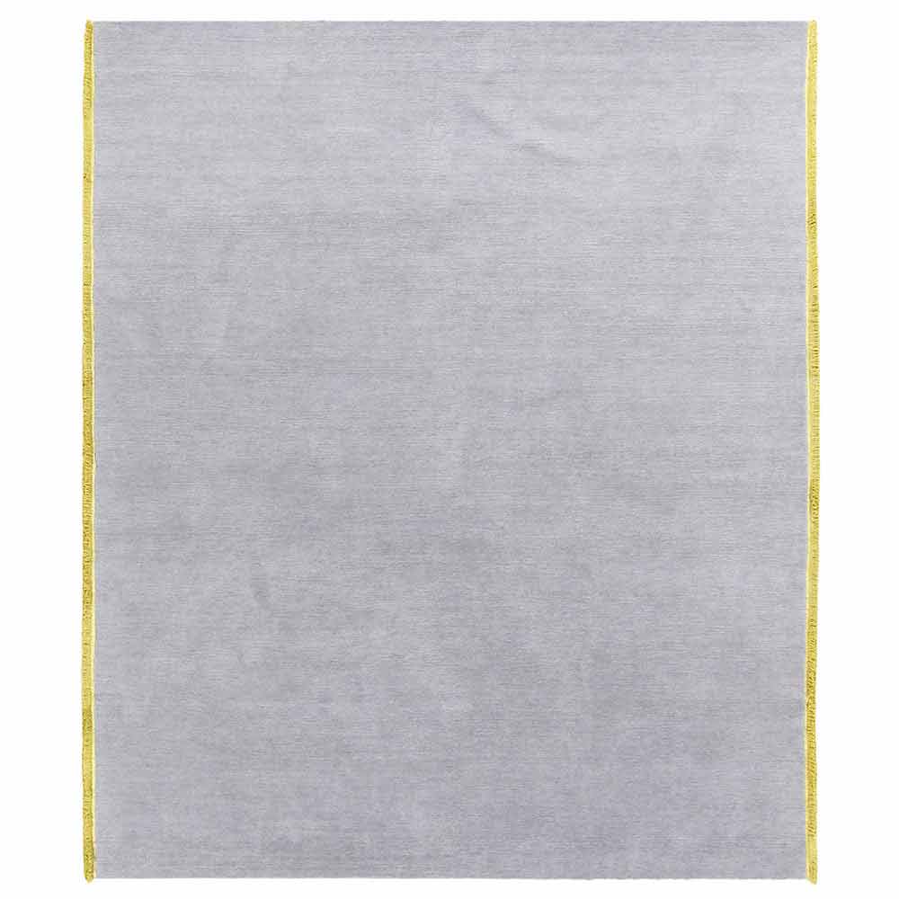 Cette ligne de tapis se caractérise par la monochromie brisée par des contrastes de couleurs qui en font un meuble contemporain et moderne. L'aspect innovant est donné par les bords frangeants composés d'un fil de soie naturel épais disponible en différentes nuances qui délimitent les côtés du tapis créant un jeu de textures et de volumes comme un cadre.