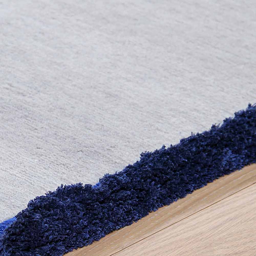 Tapis design moderne disponible en deux dimensions en laine et coton avec bordure colorée en franges de soie.