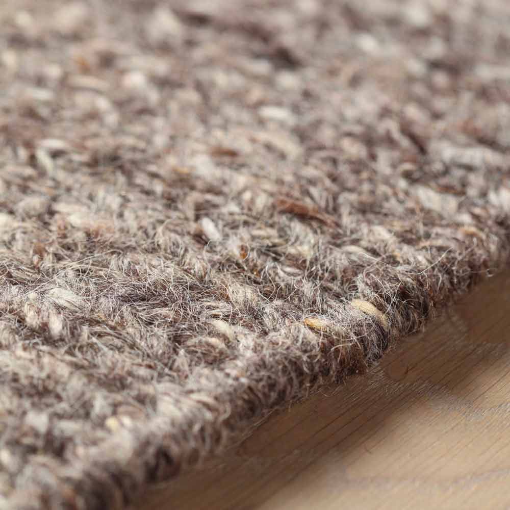 Tapis moelleux au design moderne disponible en deux dimensions en laine et coton marron ou crème.