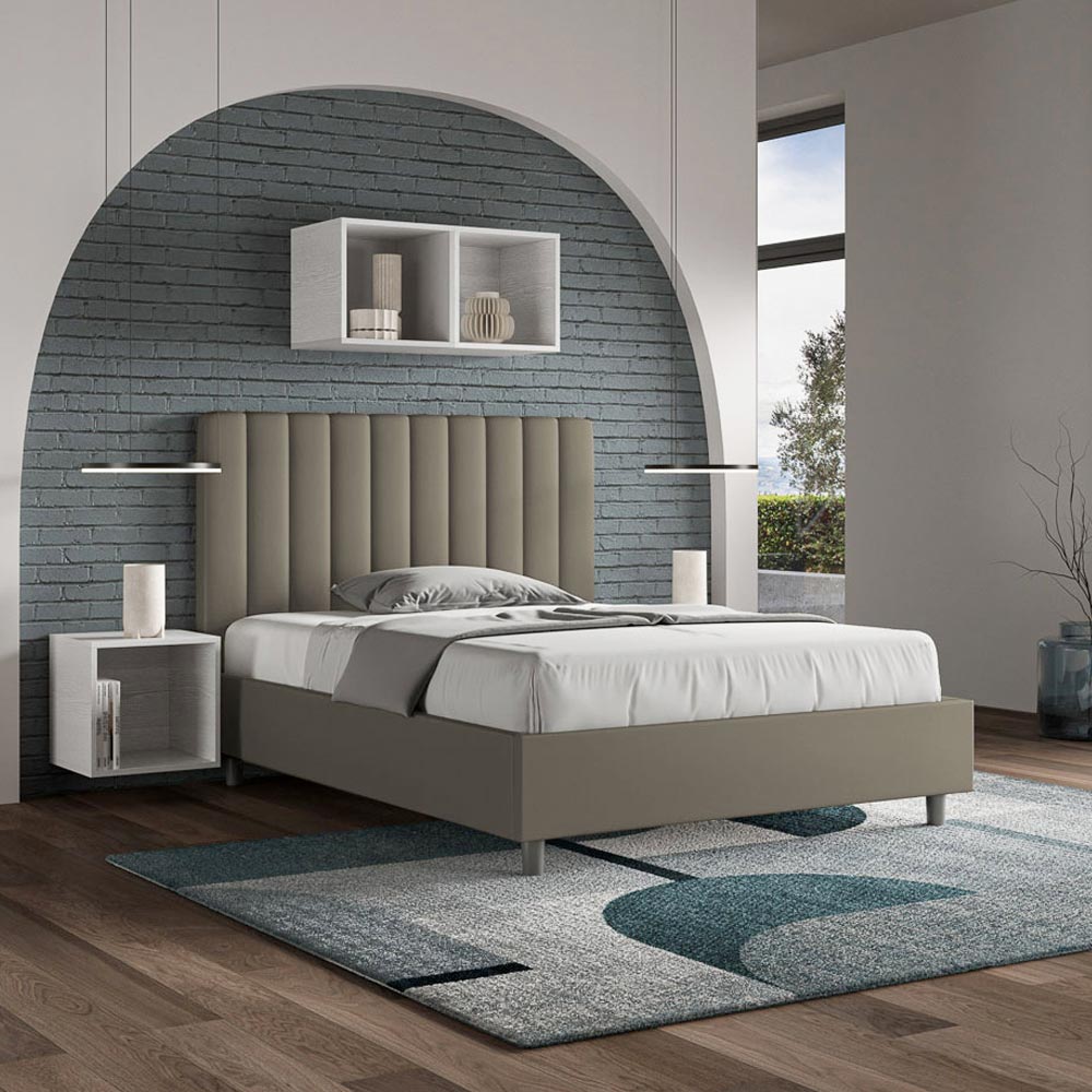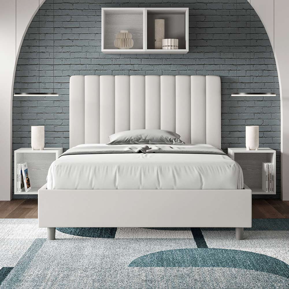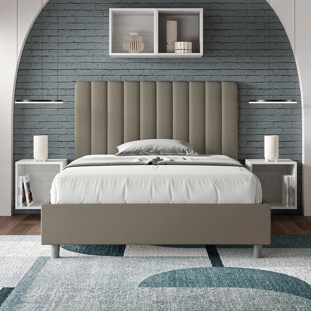 Lit queen-size rembourré de 120 x 200 cm, en panneaux de particules recouverts de simili cuir , entièrement fabriqué en Italie. Ce lit queen-size avec cadre rembourré est idéal pour ceux qui recherchent une pièce maîtresse sans être trop imposante. Sa tête de lit minimaliste, ornée d'un délicat matelassage à lignes verticales symétriques , s'intègre harmonieusement à tous les styles, modernes ou classiques. Le revêtement en similicuir apporte une touche chaleureuse et accueillante à la chambre. Particulièrement adapté aux espaces lumineux, ce matériau conserve sa couleur même après une exposition prolongée au soleil.