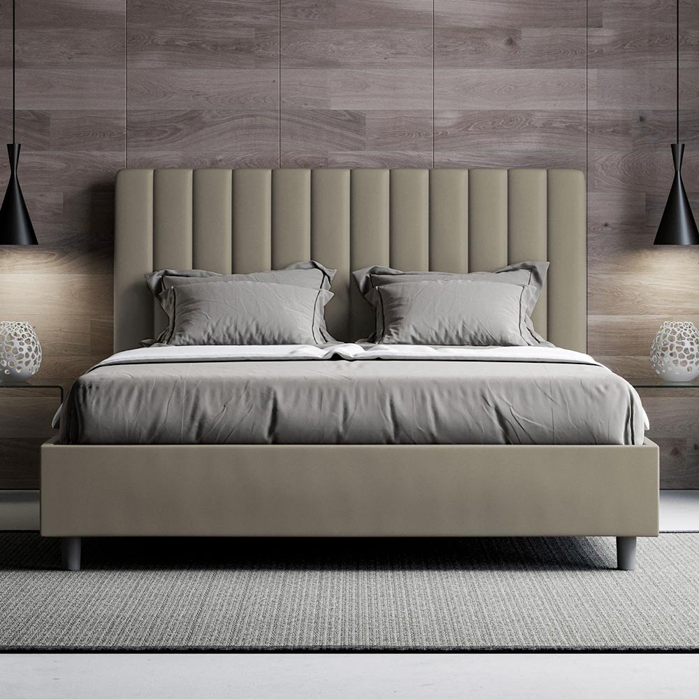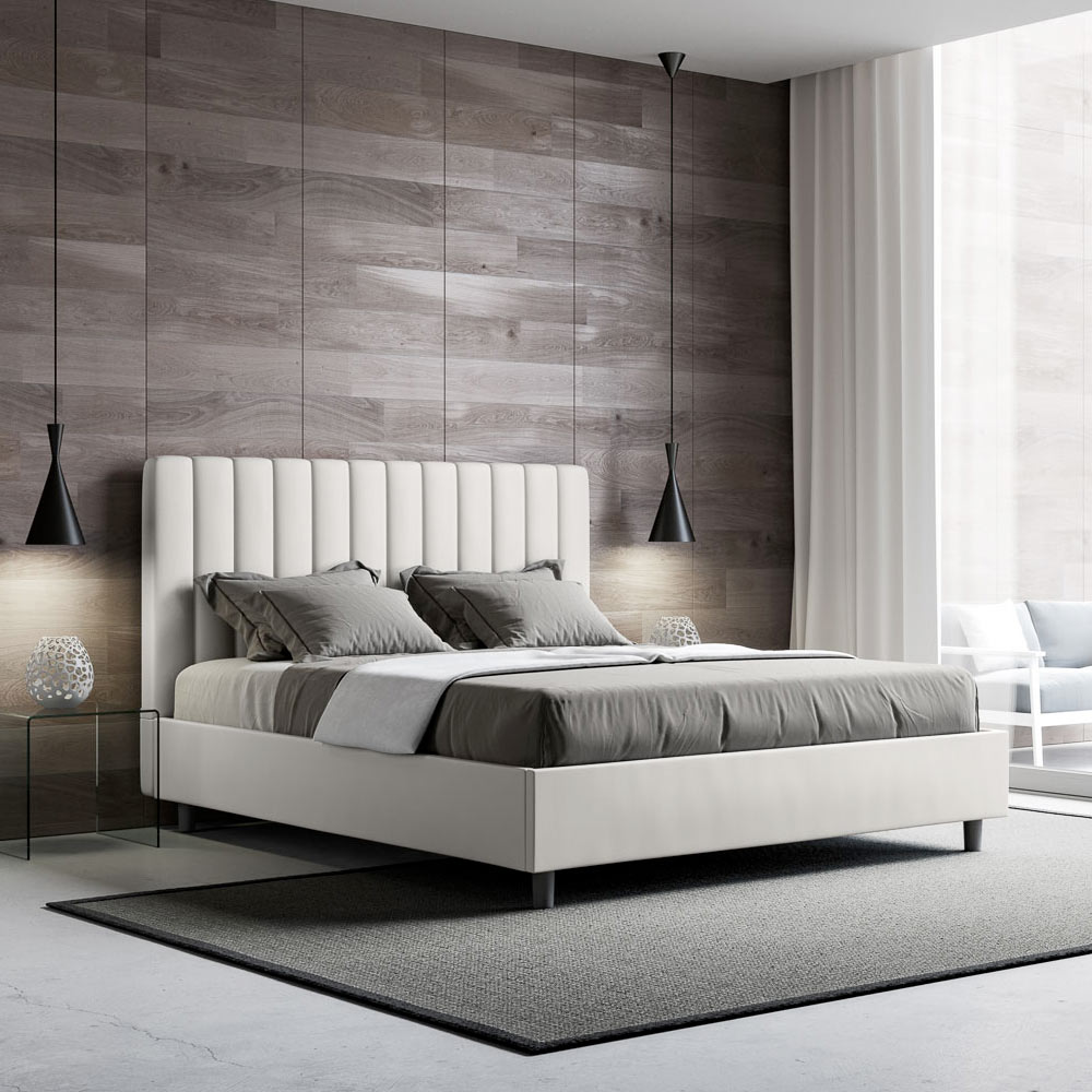 Lit double rembourré de 160 x 200 cm, composé de panneaux de particules et recouvert de simili cuir , entièrement fabriqué en Italie. Ce lit double avec cadre capitonné est idéal pour ceux qui recherchent une pièce maîtresse sans être trop imposante. Sa tête de lit minimaliste, ornée d'un délicat matelassage à lignes verticales symétriques , s'intègre harmonieusement à tous les styles, modernes ou classiques. Le revêtement en similicuir confère à la chambre une ambiance chaleureuse et accueillante. Particulièrement adapté aux espaces lumineux, ce matériau conserve sa couleur même après une exposition prolongée au soleil.
