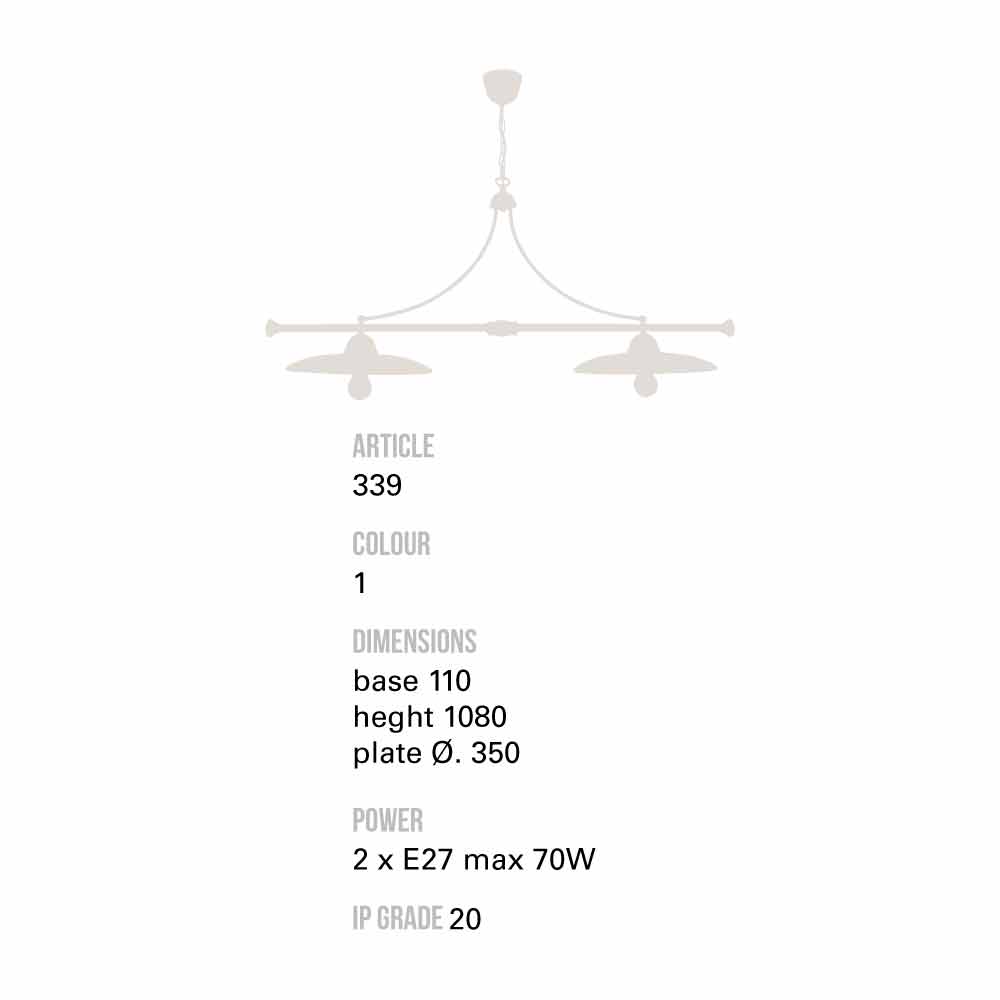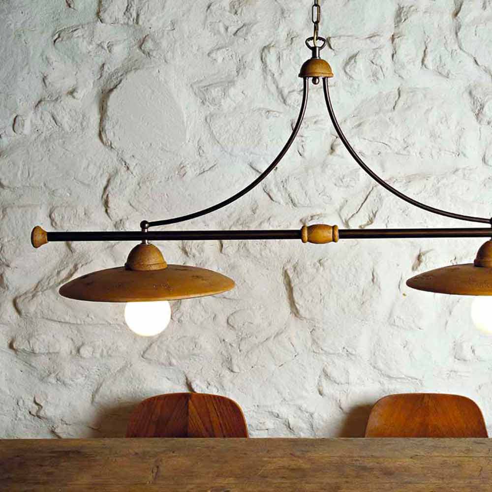 Lampe à suspension Biliardo Settimello Toscot La série Settimello proposée par Toscot comprend des suspensions au design unique. Un style rustique et rétro, mais toujours actuel, embelli par la qualité des matériaux et le savoir -faire entièrement réalisé en Toscane. Disponible en différentes teintes, sans changement de prix. Visualisez le nuancier et entrez le code de la couleur désirée dans la case appropriée. Dimensions : Socle Ø11 H.150 L.108 ; avec chaine L.50 plateaux Ø35 Ampoules : 2 x E27 max 70W IP 20 - non fournies