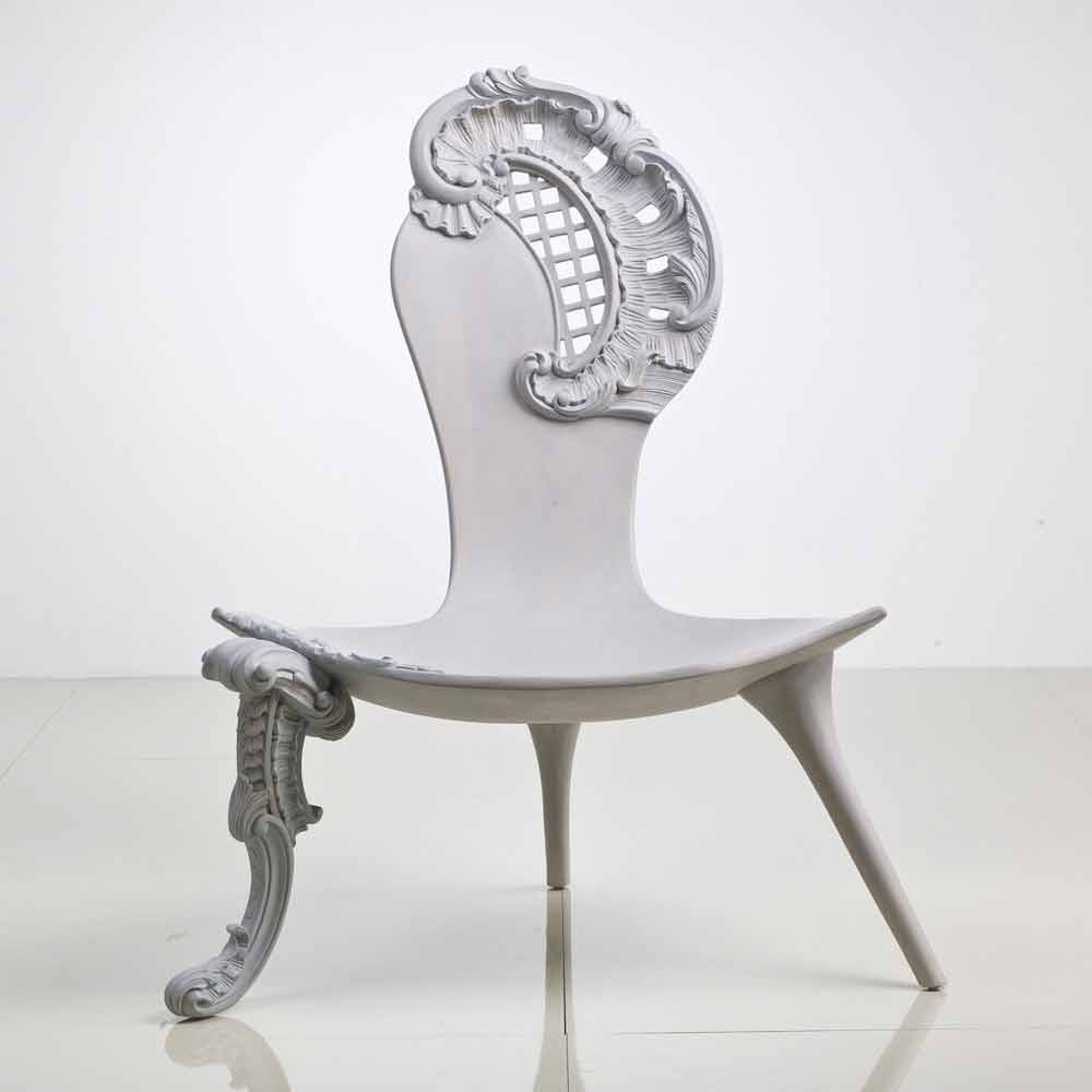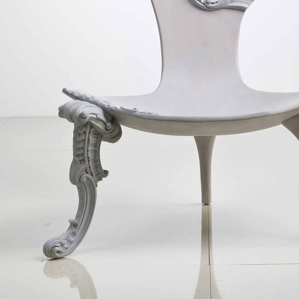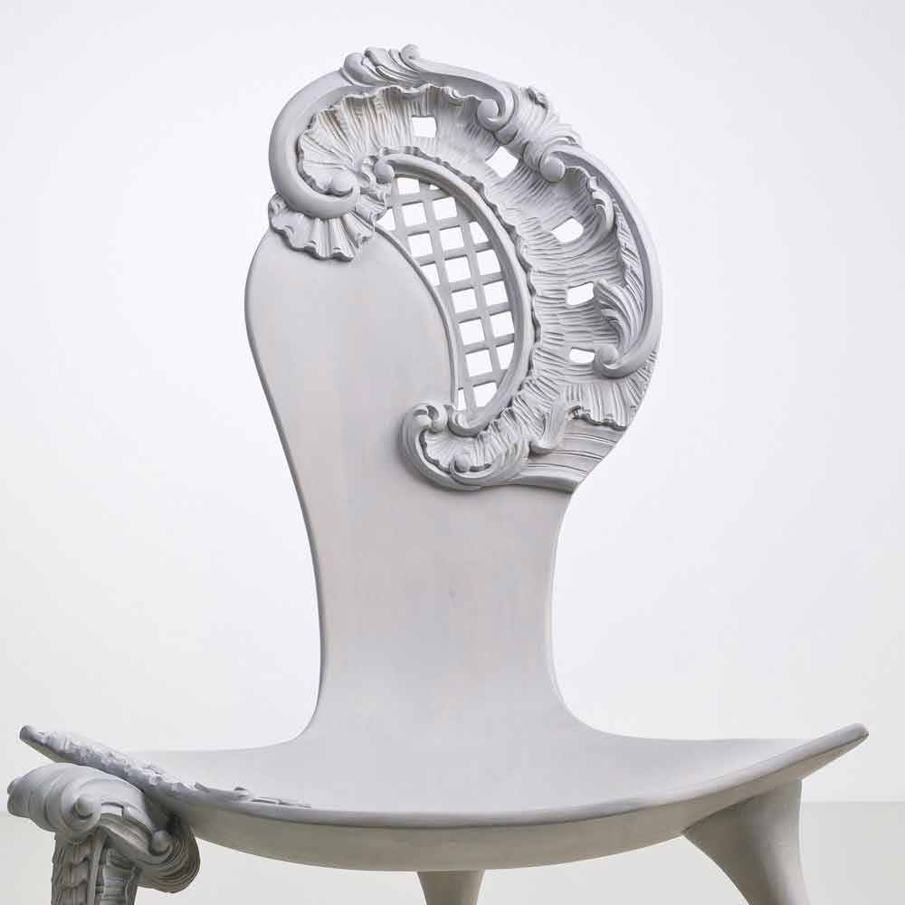 Trône sculpté à la main en bois massif chêne gris, design, Leon Leon est un trône sculpté à la main en bois massif, il a un dossier avec une décoration baroque et l'assise en bois massif. Une feuille de bois lisse définit le profile doux, dans certaines de ses parties il évolue dans un luxuriant travail baroque. Presque comme si le bois prenne lentement vie, sur la fauteuil grandit une sorte de chapeau floral avec aussi une voilette. La jambe en revanche s'enrichit de complexes frisages ligneuses. Finition chêne gris (gris fumé).