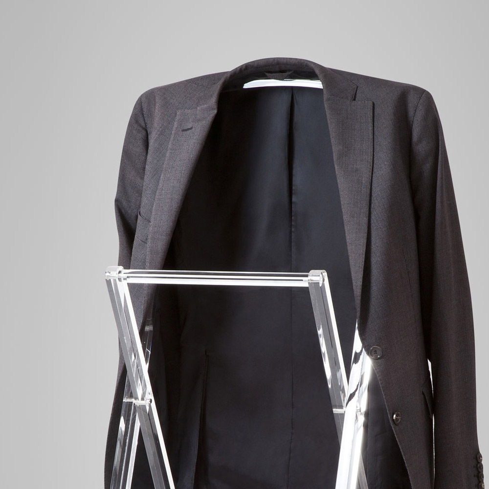 Ce valet de chambre a un design pliable élégant et minimal qui devient un véritable meuble fonctionnel et décoratif . Fabriqué entièrement en cristal acrylique transparent avec des pieds d'une épaisseur de 20 mm, la particularité est l'étagère inférieure amovible pour permettre au produit de se fermer et d'optimiser l'espace.
