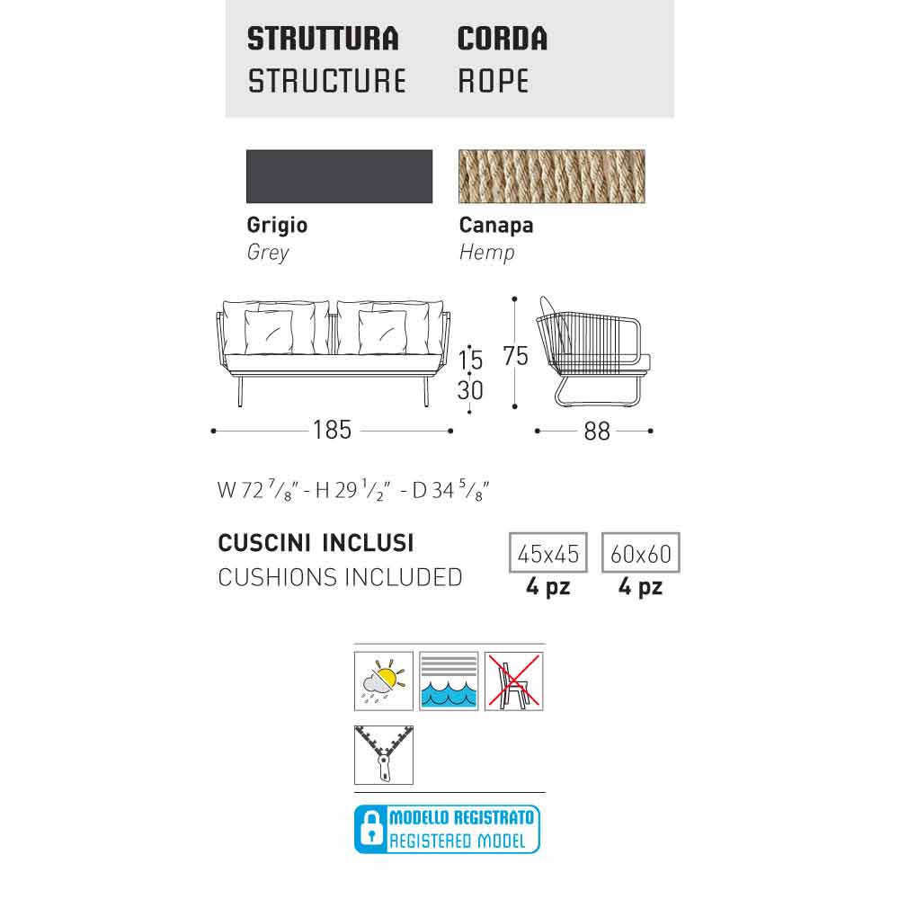 Le canapé moderne Babylon par Varaschin peut être utilisée aussi bien dans le jardin ou au bord de la piscine, que dans la salle à manger. Il est fourni avec 8 coussins décoratifs : n° 4 coussins 45x45 cm et n°4 coussins 60x60 cm. Le revêtement est déhoussable.