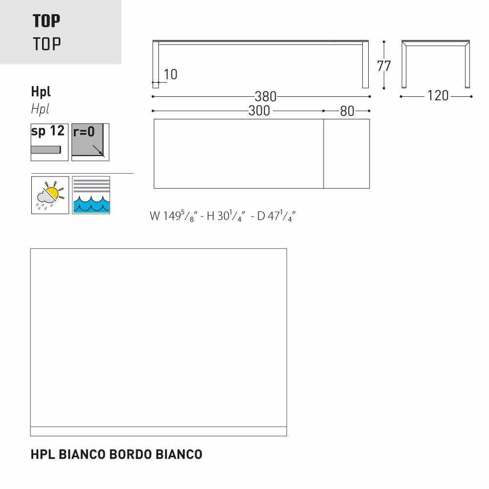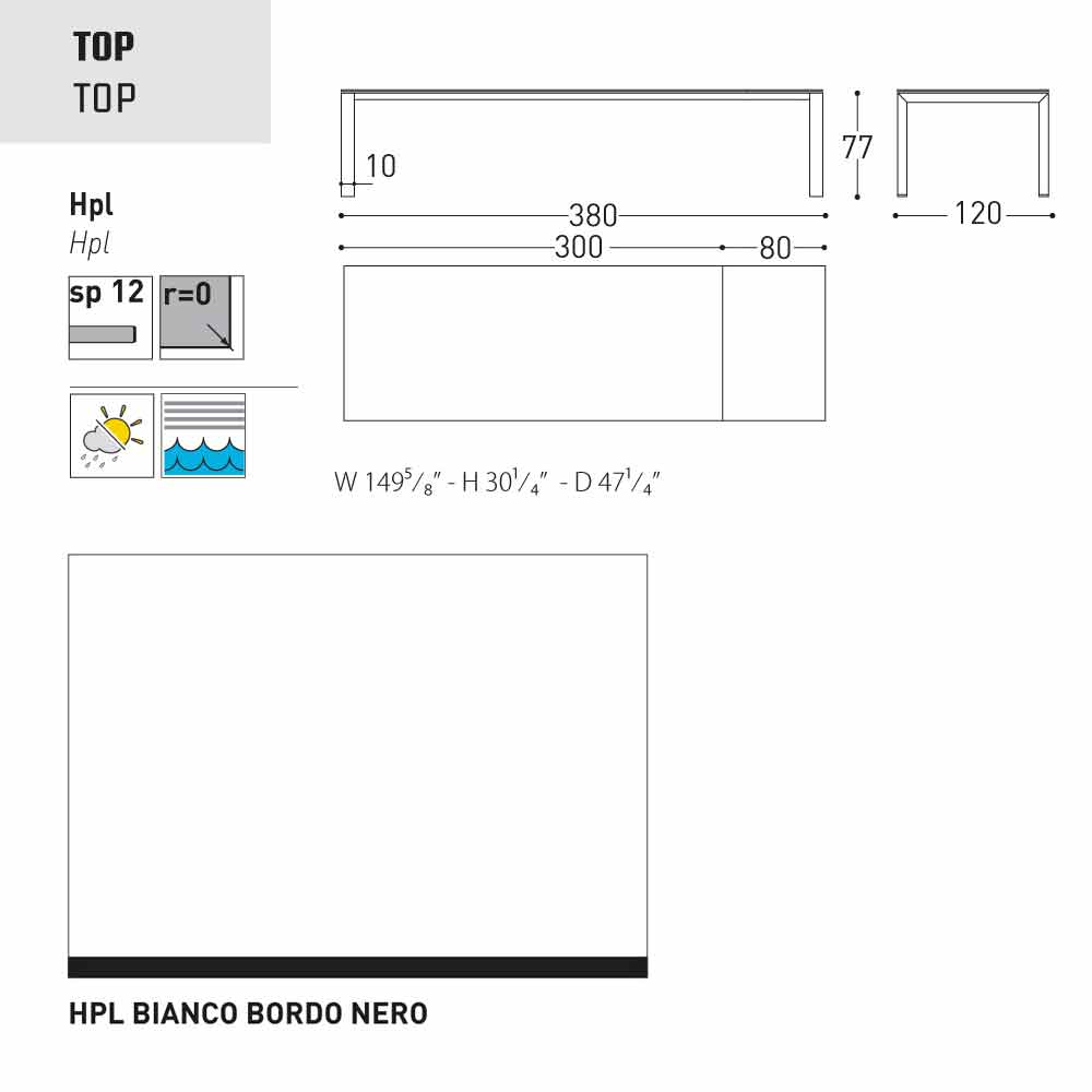 - 120x 300/380 x H 77 cm ; 1 rallonge de 80 cm