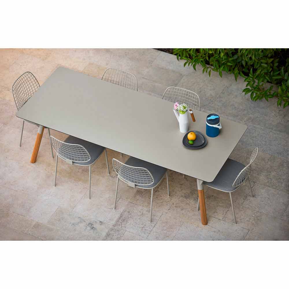 Link est une table de repas de design moderne avec cadre en acier inoxydable verni et pieds en bois de teak. Le plateau est disponible en HPL ( épaisseur 12 mm) ou en bois de Teak ( épaisseur 30 mm).(spessore 30 mm). Grâce à son design polyvalent la table de salle à manger d'extérieur Link peut être utilisée aussi bien dans le jardin que dans la salle à manger.