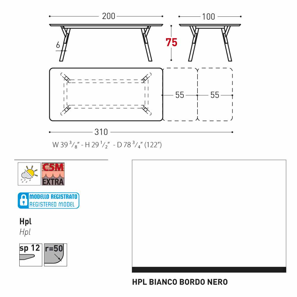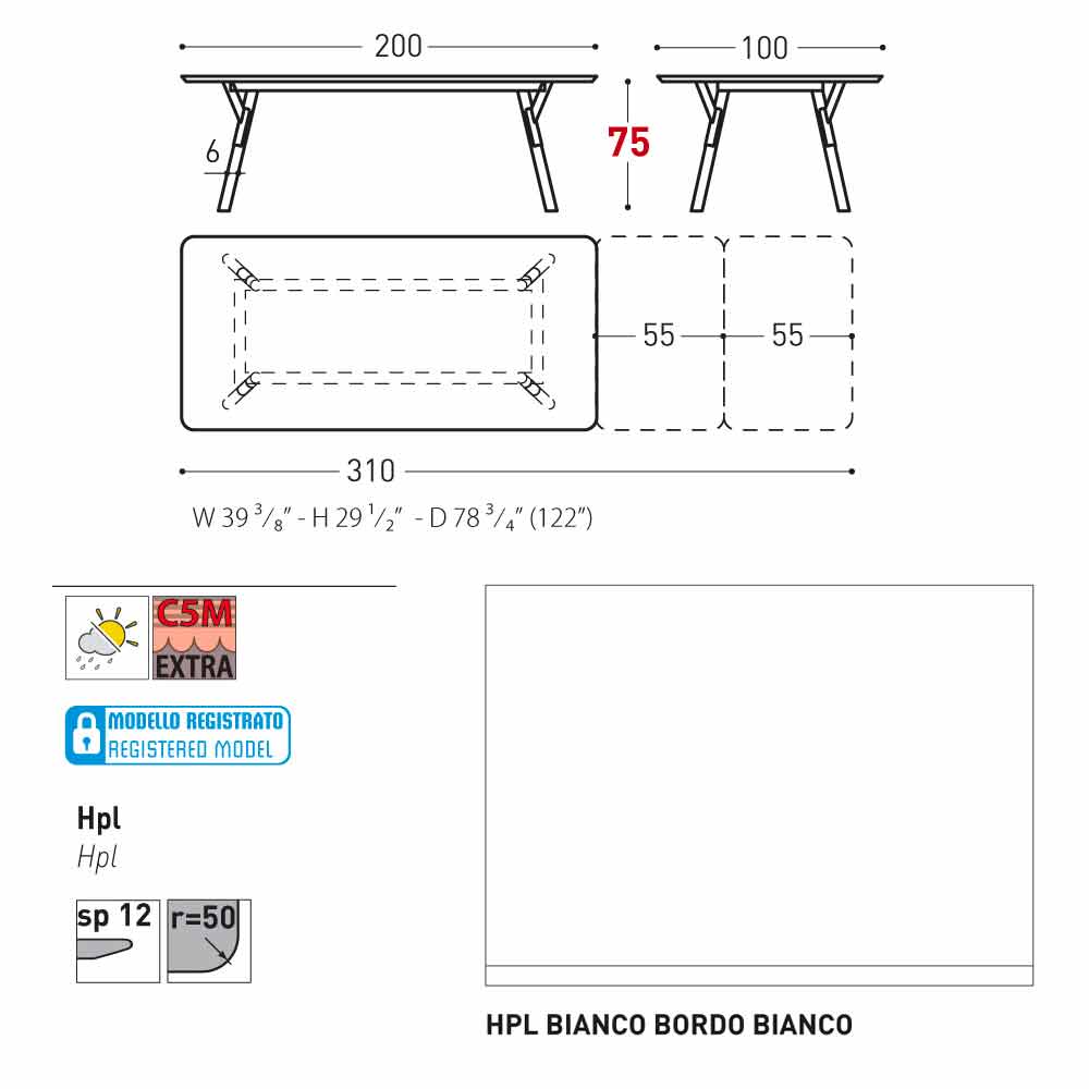 100x200/310xH75 cm - 2 rallonges de 55 cm