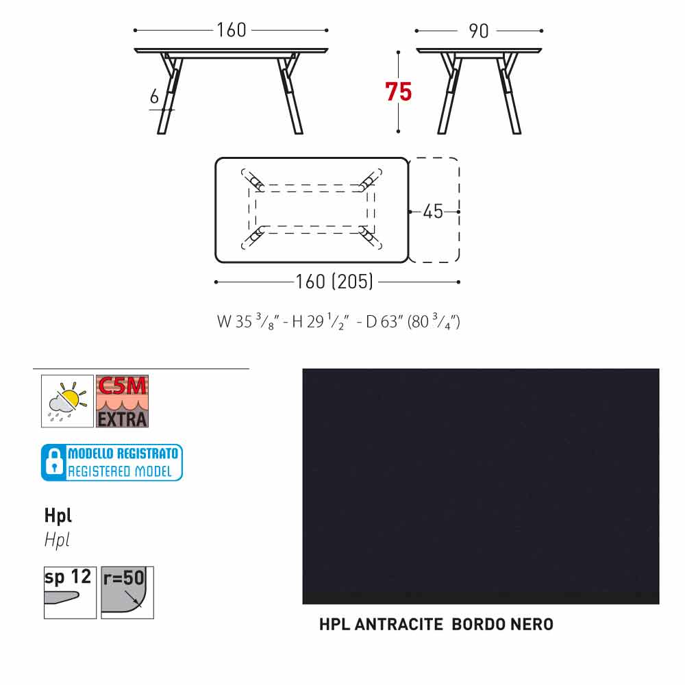 90x160/205x H 75 cm - 1 rallonge de 45 cm