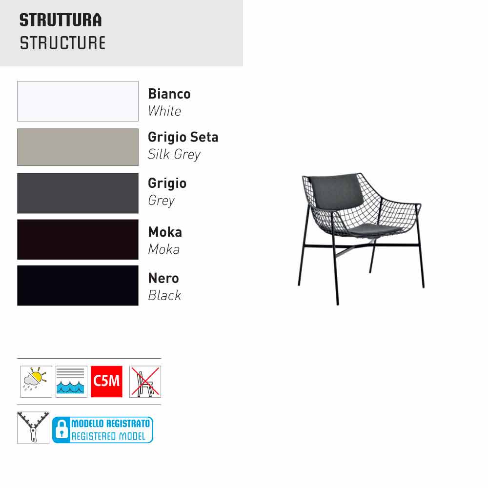 Fauteuil en tissu avec structure en acier verni à poudres. Modèle enregistré. Summer set est un fauteuil d'extérieur qui peut être utilisé aussi bien à l''intérieur. Il est fourni avec coussin d'assise et coussin de dossier.