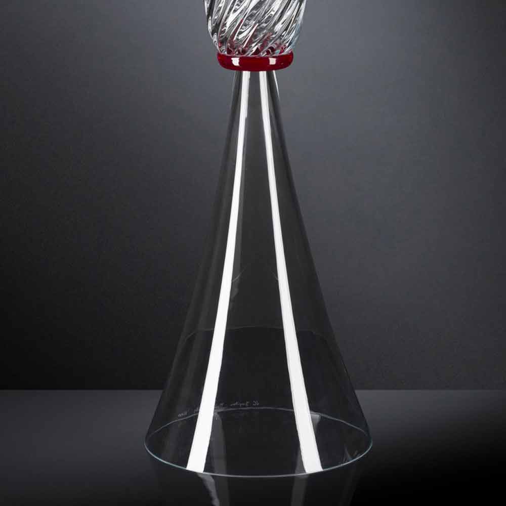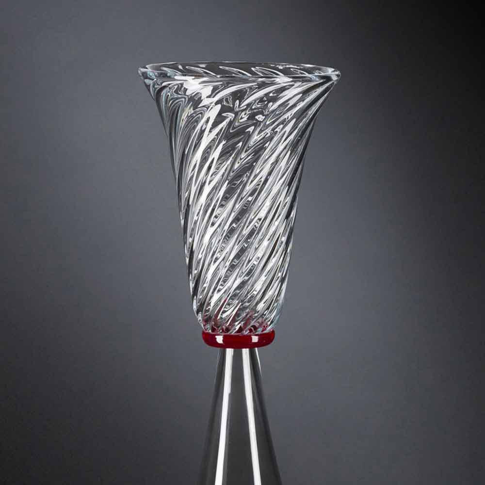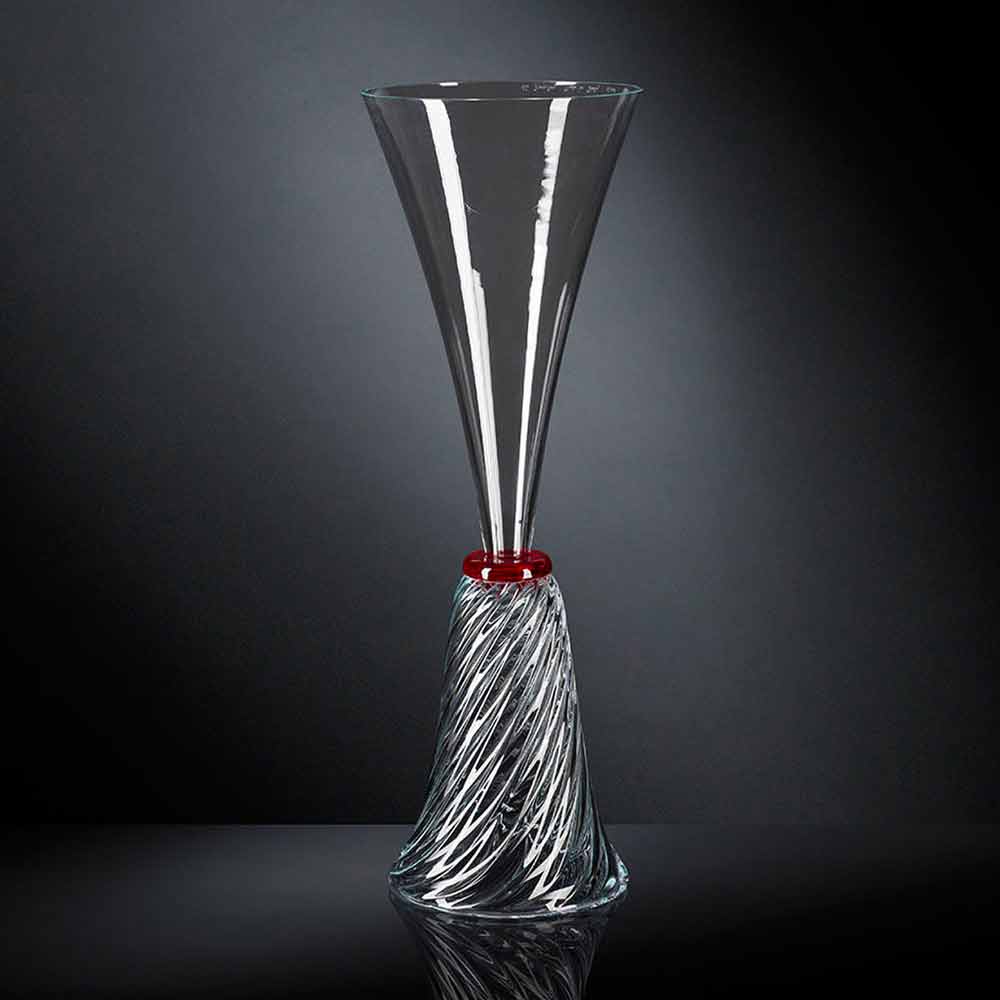 Vase d'intérieur élégant enverre soufflé de Murano transparent avec détail rougegrâce à un processus entièrement Made in Italy . Un design unique et raffiné qui rappelle les formes d'un sablier revisitées dans une touche contemporaine pour donner vie à une idée de mobilier exclusif et avant-gardiste. Son esthétique s'avère particulièrement polyvalente grâce aux finitions neutres utilisées qui soulignent à la fois sa valeur et sa haute qualité ainsi que la magnifique finition qui caractérise la partie supérieure du vase. Un style idéal pour les environnements les plus variés, de l'ameublement à celui des hôtels, restaurants, zones contract, spas mais aussi comme cadre pour des événements et des mariages.