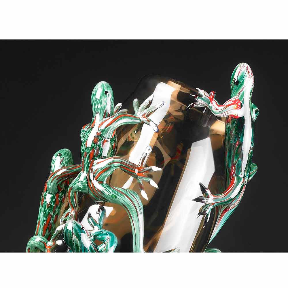 Vase d'intérieur fabriqué artisanalement en Italie en verrebrun fabriqué à la main par des maîtres verriers experts du secteur depuis des générations enrichi de 8 geckos dans les tons rouge, bleu et vert. Sa particularité est représentée par la production artisanale qui augmente sa valeur et sa valeur pour donner vie à un résultat exclusif et de haute qualité . Un élément décoratif excentrique pour vos espaces capable de donner une touche originale grâce à sa forte personnalité créative . Le résultat est un objet simple pour la maison capable d'enrichir le style de n'importe quelle maison avec originalitégrâce à son âme moderne et son design avant-gardiste .