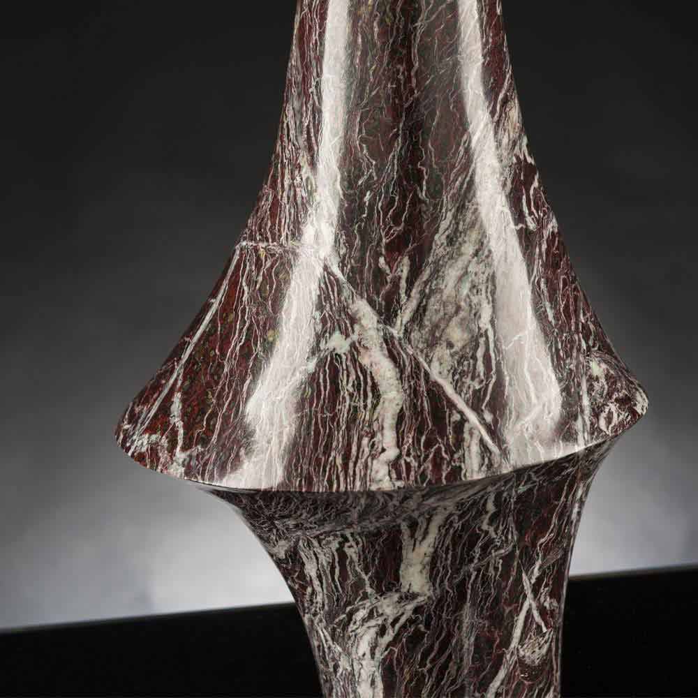 Vase élégant pour les intérieurs en marbre rouge Antico d'Italia, un prestigieux matériau violet foncé avec des veines dans les tons de vert et de blanc fabriqué à travers une production 100% Made in Italy . Sa production passe par le traitement des pierres naturelles avec des pantographes à 5 axes qui permettent d'obtenir des formes plus complexes que de simples volumes de rotation. Ce meuble élégant est né de l'union entre l'étude des phénomènes naturels et l'interaction des matériaux utilisés avec la technologie humaine pour donner vie à un style de mobilier unique et avant-gardiste. Le résultat est un élément décoratif exclusif capable d'enrichir n'importe quel environnement avec une esthétique moderne et raffinée avec de la personnalité. Un style idéal pour les environnements les plus variés, de l'ameublement à celui des hôtels, restaurants, zones contract, spas mais aussi comme cadre pour des événements et des mariages.