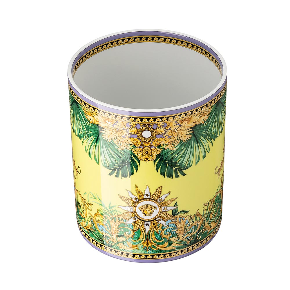 Le vase Jungle Animalier de Versace , fabriqué en porcelaine fine , est un chef-d'œuvre qui allie élégance exotique et luxe intemporel. Le superbe design présente un jaune vif, orné de motifs tropicaux de feuillage luxuriant et de détails baroques complexes, le tout encadré par le légendaire symbole Medusa au centre, serti d'un soleil brillant et décoré de détails dorés.