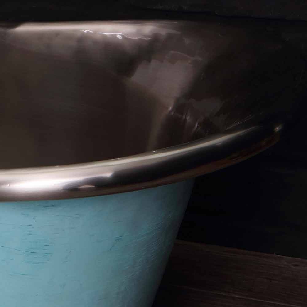 Vasque à poser avec finition nickel satiné et Calla vert-de-gris Lavabo de salle de bain à poser entièrement en cuivre, avec finition intérieure en nickel satiné et finition extérieure en vert-de-gris, entièrement fait à la main. Lavabo design de style vintage qui allie beauté et élégance, donne une touche de classe à votre intérieur!
