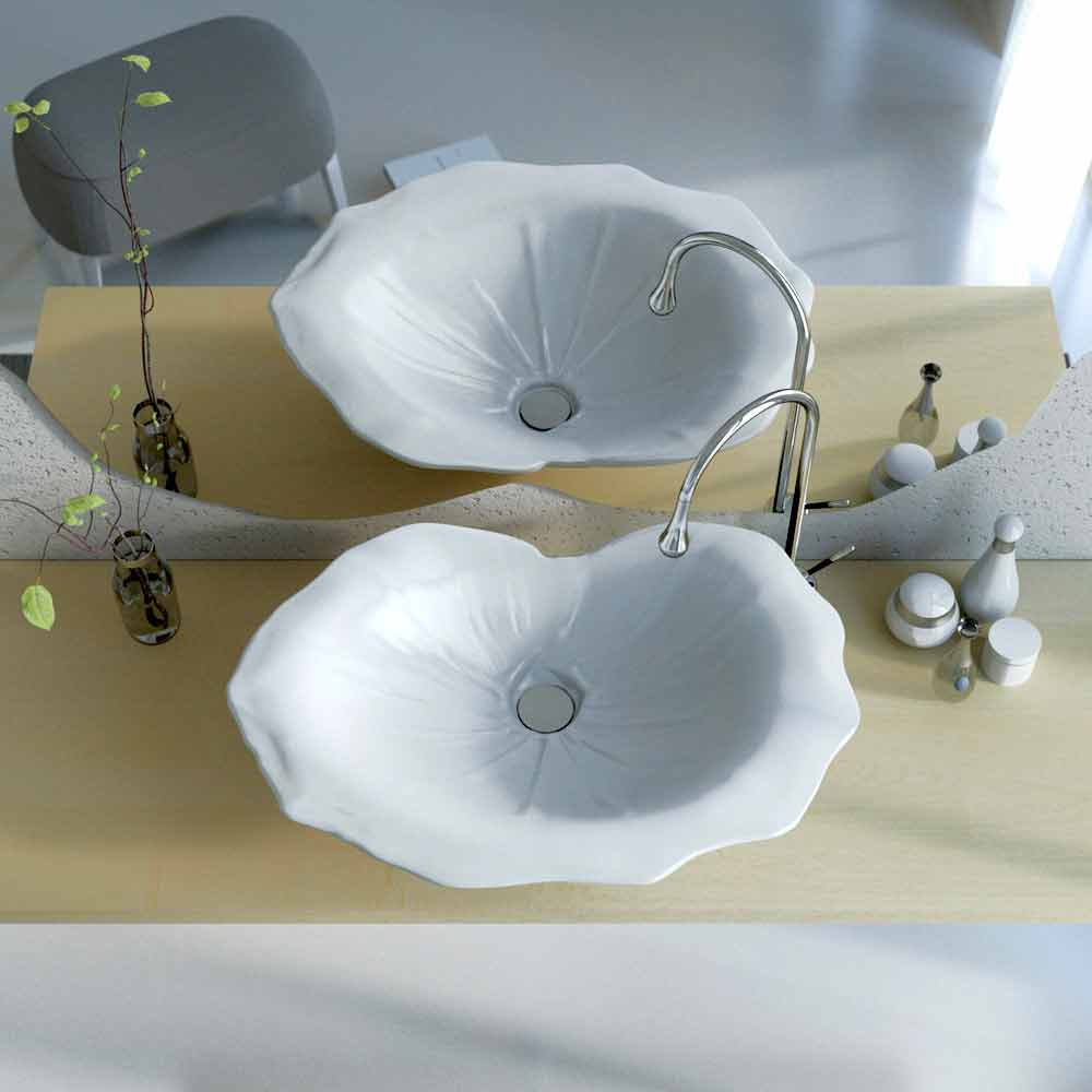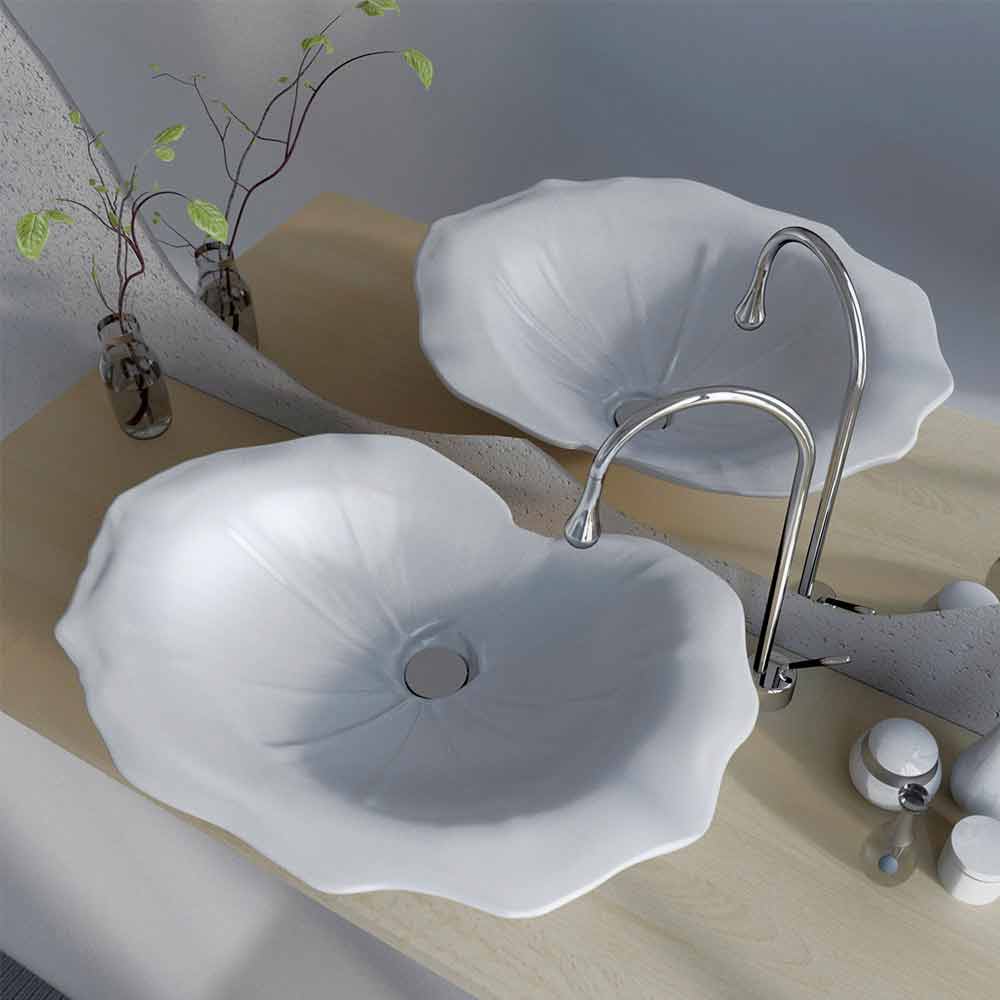 Lavabo à poser au design moderne en forme de feuille de Faruglium Matériau : Surface solide ; Finition : Laqué brillant / mat disponible en différentes variations chromatiques Créateur : Fabio Crimi Dimensions : L. 60 x P. 43,5 x H. 15 cm Poids : 3,5Kg