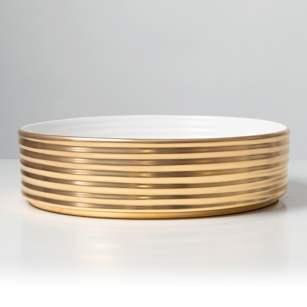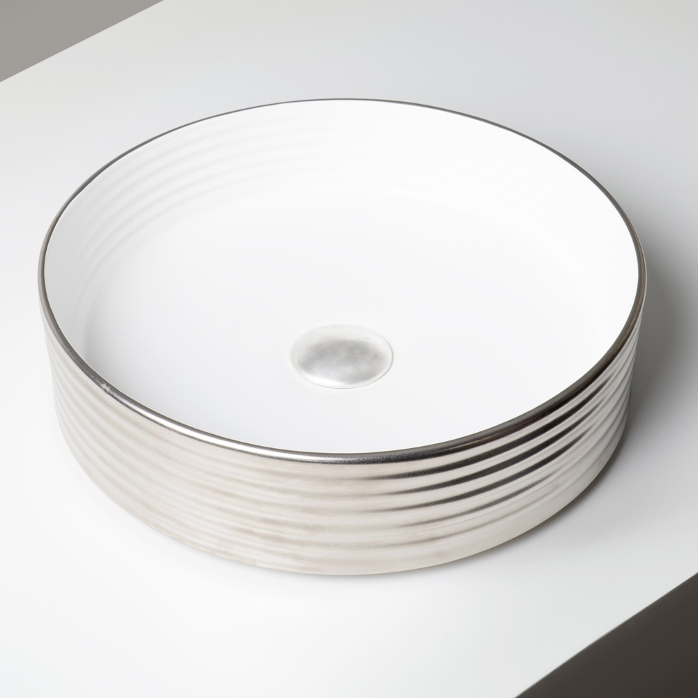 Cet évier de comptoir en grès cérame, tourné à la main , se distingue par ses surfaces ondulées ornées de bandes horizontales qui captent la lumière et transforment la matière en un élément fluide, doux et raffiné. Un objet design qui allie recherche esthétique et savoir-faire artisanal.