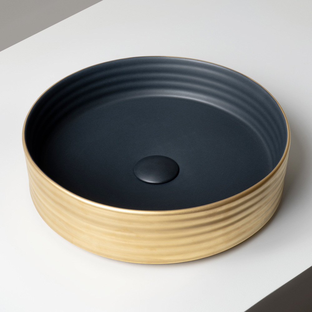 Le contraste entre l' intérieur émaillé et les finitions extérieures confère au lavabo une allure raffinée et contemporaine, en faisant un véritable bijou pour la salle de bains. La palette de couleurs élégante et sophistiquée met en valeur ses volumes grâce à des reflets irisés et une profondeur texturée.