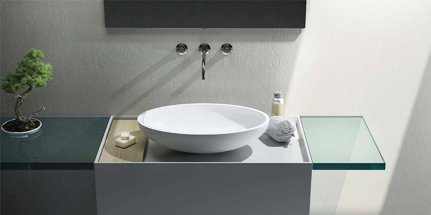 Vasque à poser ovale en Solid Surface, Frascati Frascati est un lavabo sur pied en Solid Surface avec une plante ovale. Grâce à sa grande capacité et à son design ultra-moderne, il est le lavabo de salle de bains le plus recherché.
