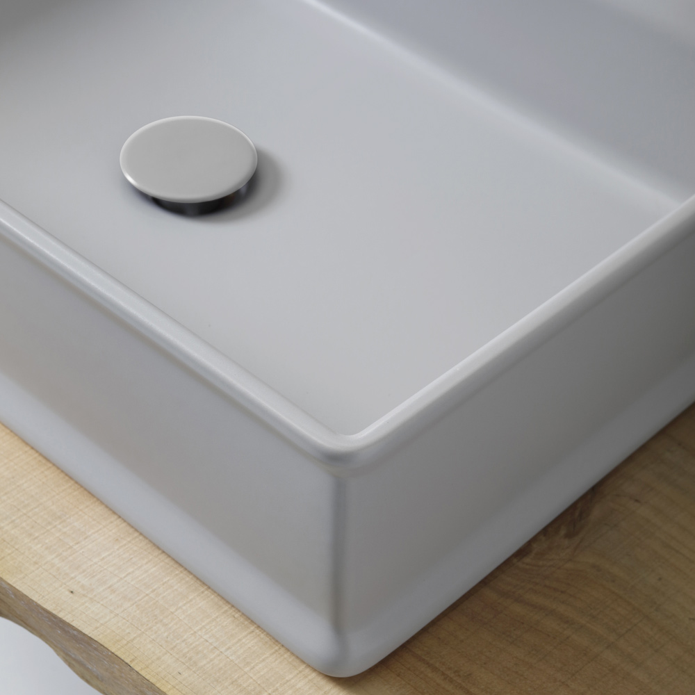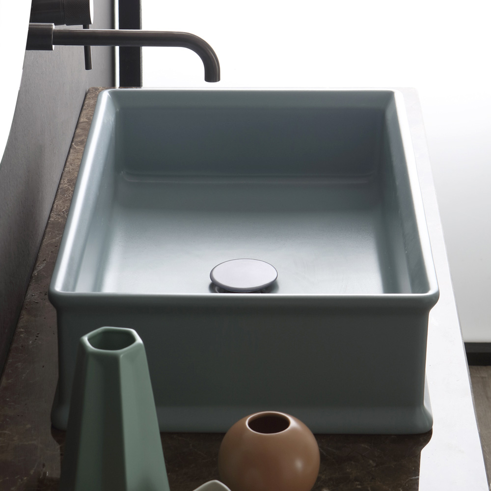 Vasque à poser rectangulaire en céramique de couleur opaque grâce à un savoir-faire 100% Made in Italy . Un design caractérisé par des lignes et des caractéristiques fortes et imposantes fait de ce meuble une réinterprétation contemporaine parfaite d'une esthétique à l'âme rétro grâce à l'utilisation de la couleur donnant vie à un résultat exclusif et raffiné .