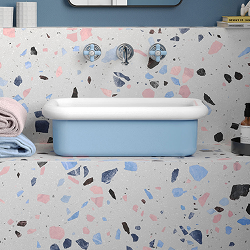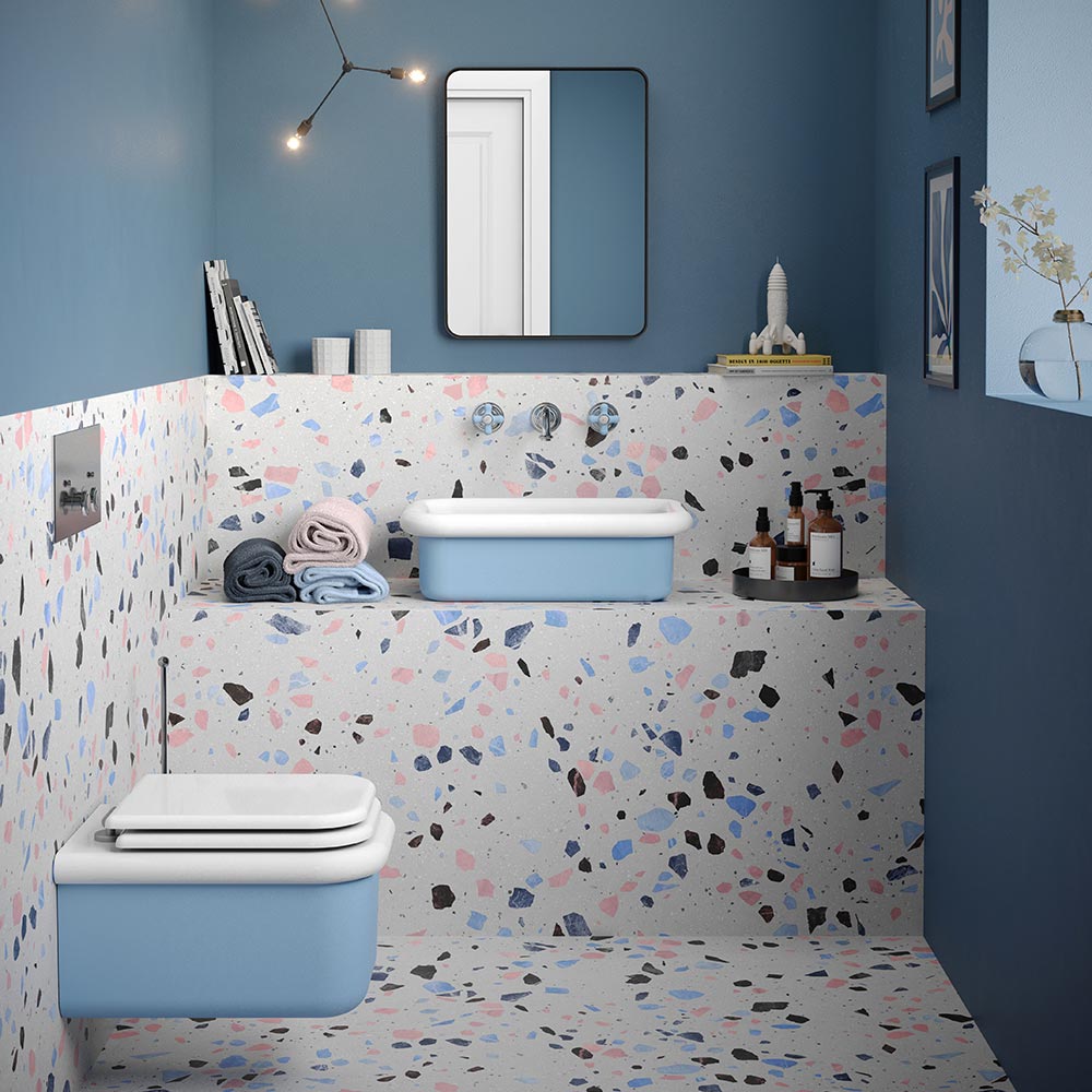 Lavabo de salle de bain avec structure rectangulaire sur le dessus en céramique bicolore, blanc ou bleu pastel ou noir mat.
