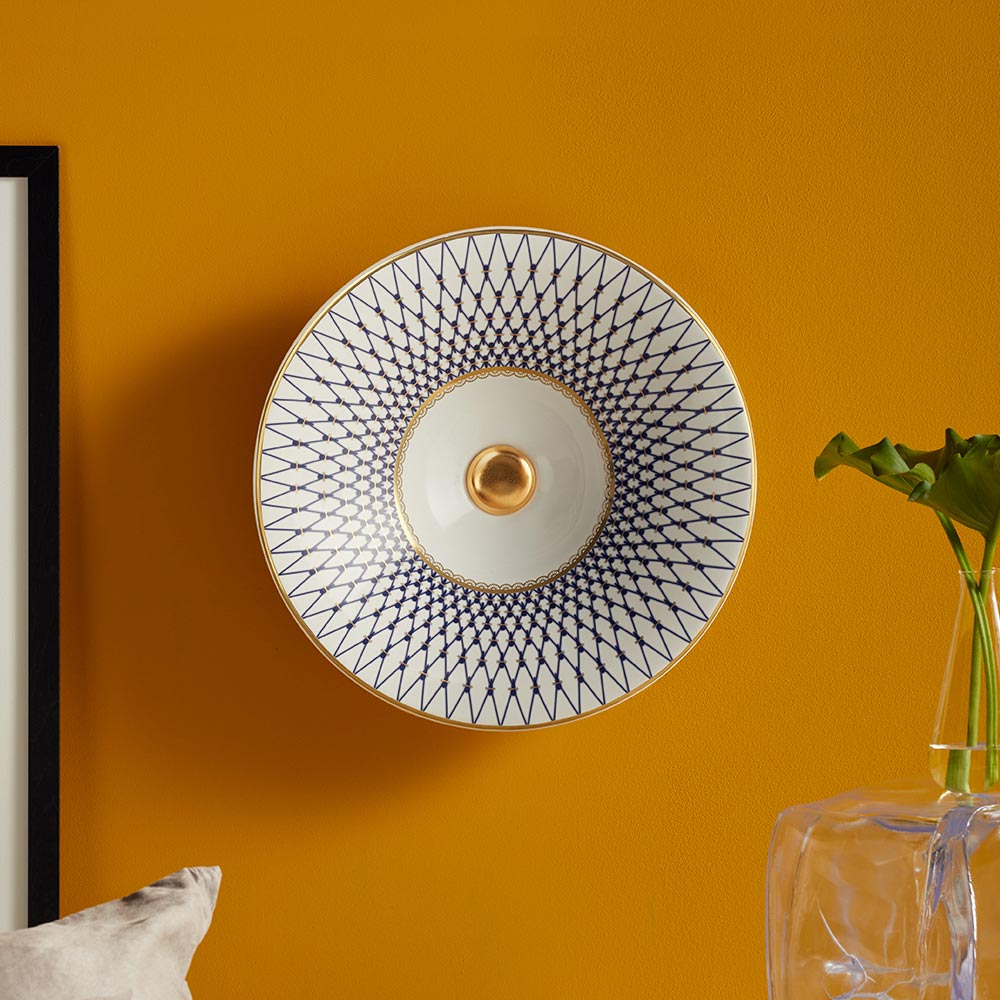 - décor intérieur en relief capitonné bleu sur émail blanc, extérieur émail blanc