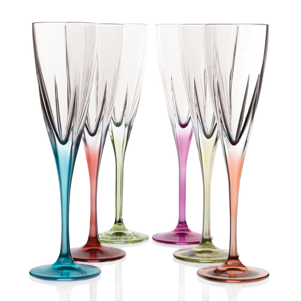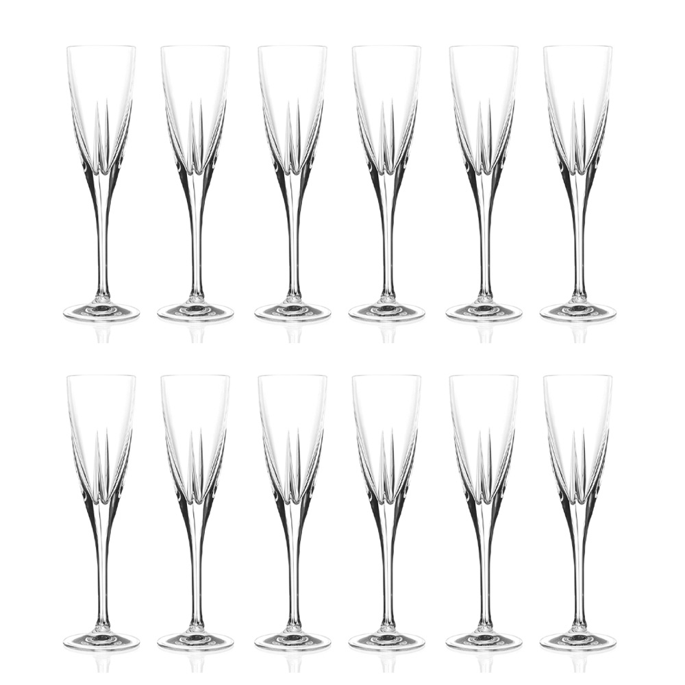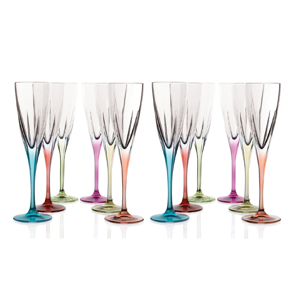 Ensemble de verres à flûte en cristal écologique transparent ou coloré, 12 pièces fabriquées en Italie.