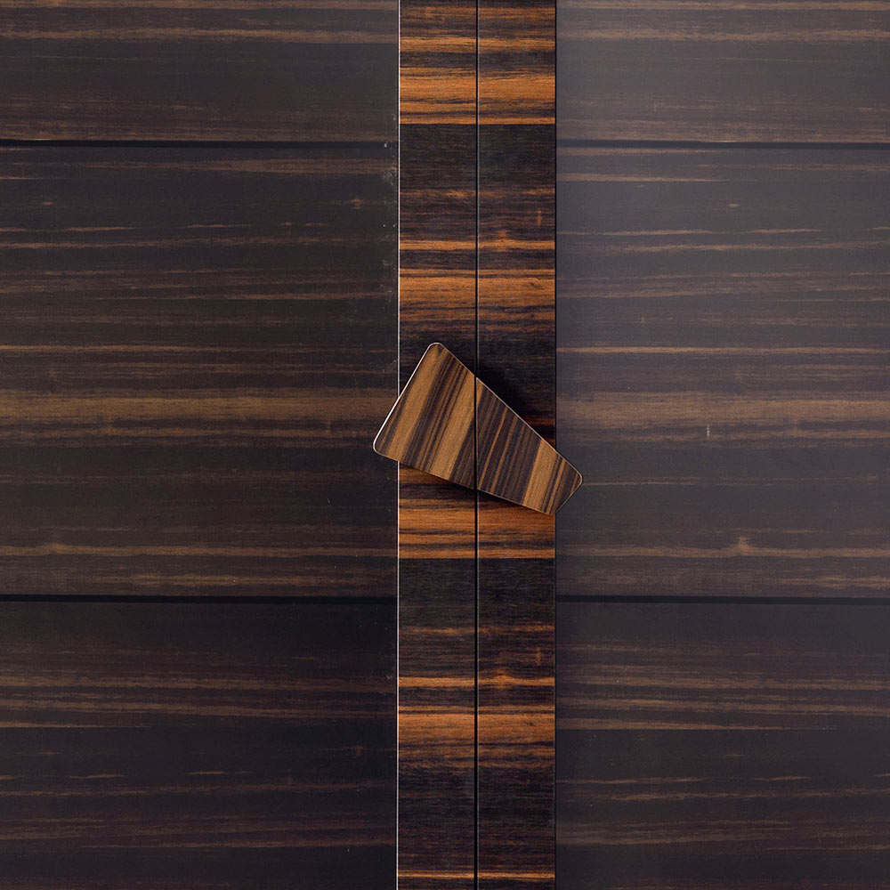 La vitrine a une structure multicouche et toulipier en bois massif et plaqué d'ébène. La base est en bois massif teinté. À l'intérieur, il y a des étagères en verre fumé, tandis que la commode interne est disponible sur demande .