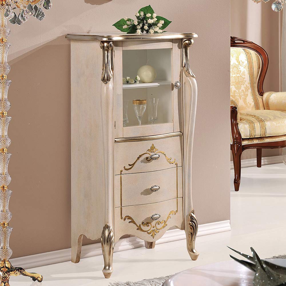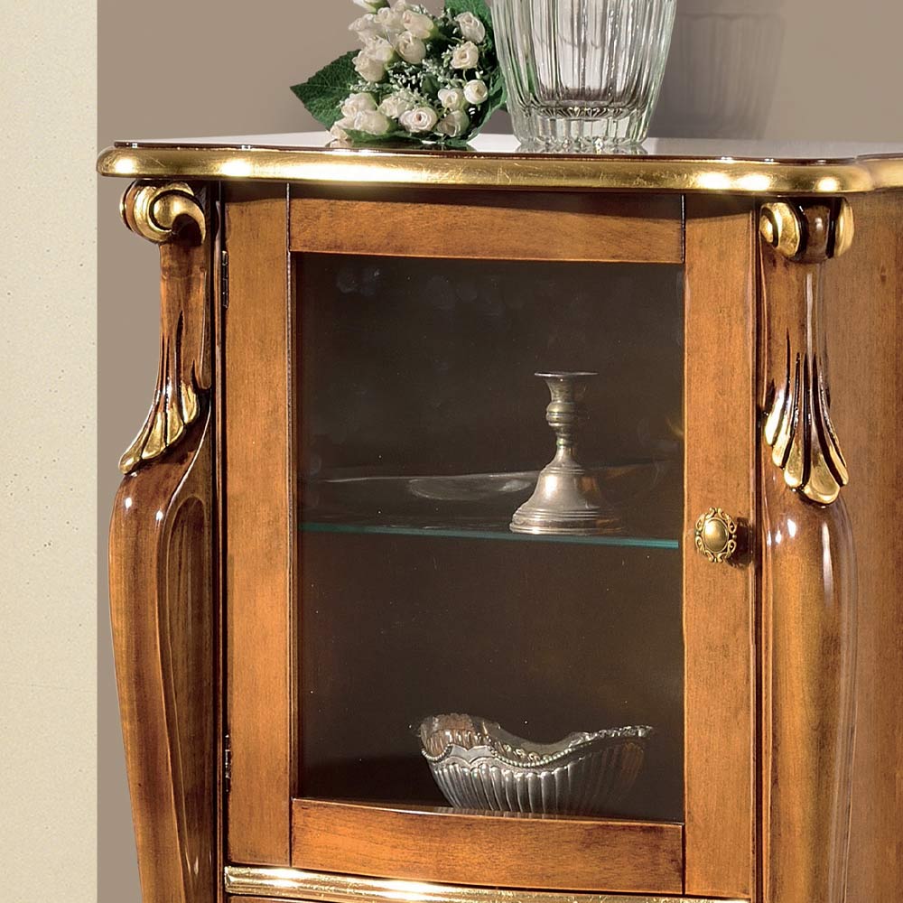 Vitrine pour salon avec structure en bois et complète avec porte vitrée et 3 tiroirs pratiques conçus pour meubler votre salon avec une élégance intemporelle. Disponible en deux variantes : noyer Bassano et finition or antique ou en bois blanc et argent . Un complément unique et raffiné, entièrement fabriqué en Italie par des maîtres artisans qualifiés , des maîtres d'art qui finissent chaque complément avec sagesse et goût pour l'élégance. La production est réalisée en utilisant des matériaux nobles et en réalisant le travailà la main avec le plus grand soin et le professionnalisme qui distinguent les produits Made in Italy .