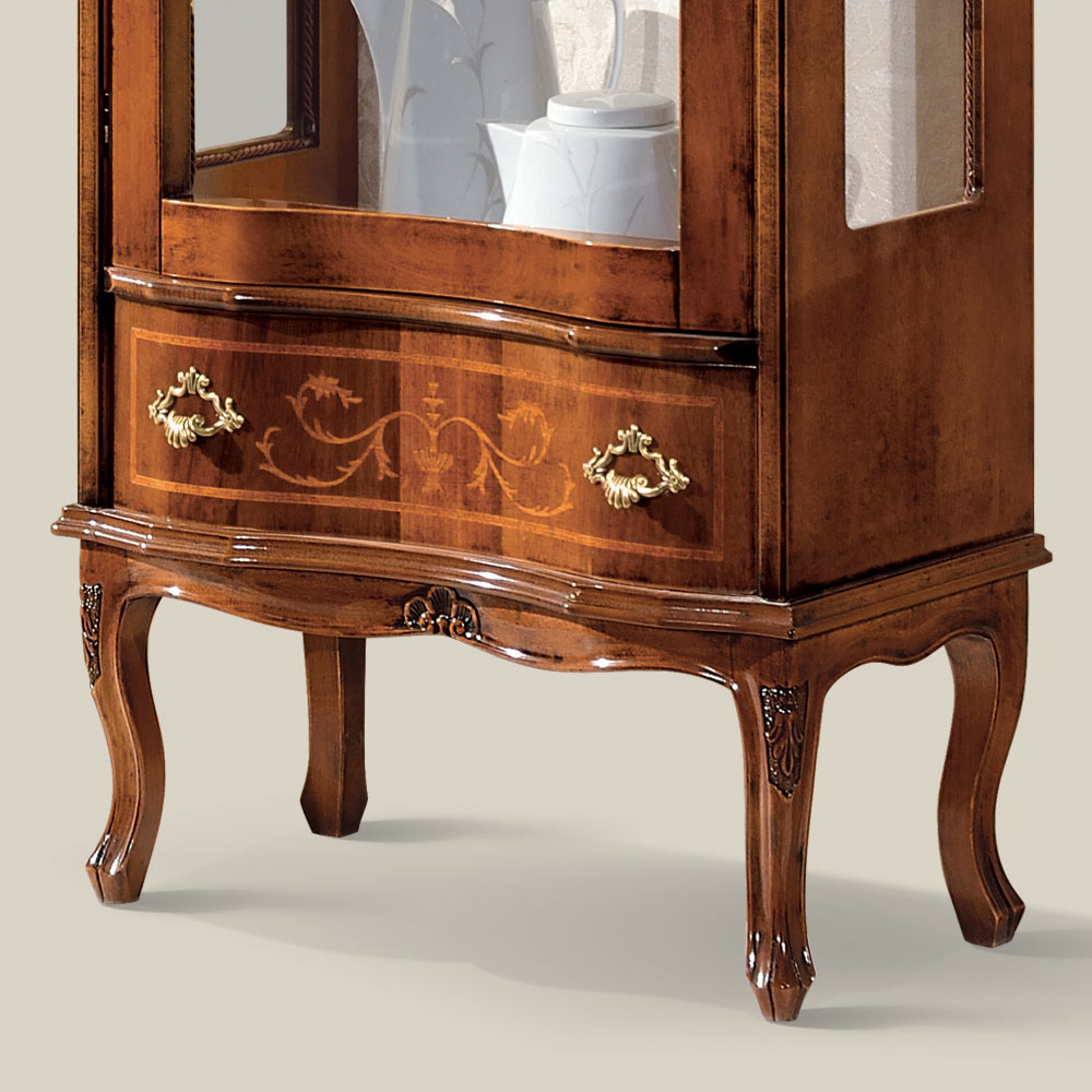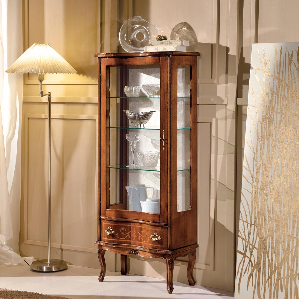 Vitrine de salon en bois précieux finition noyer avec une porte et un tiroir. Élégante et intemporelle, cette vitrine de style classique est idéale pour créer des décors impressionnants. Entièrement fabriqué en Italie et fabriqué à la main par des maîtres artisans qualifiés , fini avec sagesse et goût pour l'élégance. La production est réalisée en utilisant des matériaux nobles et en réalisant le travailà la main avec le plus grand soin et le professionnalisme qui distinguent les produits Made in Italy .