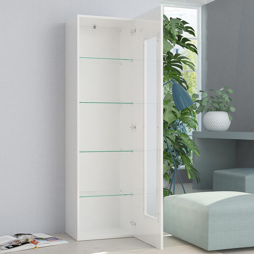 Les lignes pures et sans poignée assurent un look élégant et contemporain conçu pour une fonctionnalité maximale. La vitrine est faite de bois durable mélaminé robuste et résistant avec un look minimal et raffiné mais aussi facile à nettoyer.