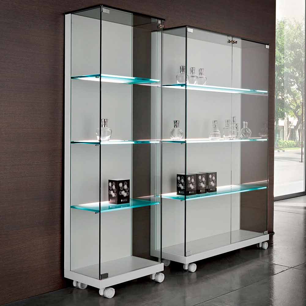 La vitrine à deux portes avec roues pour faciliter le mouvement est en verre trempé transparent et une structure en bois laqué blanc mat.