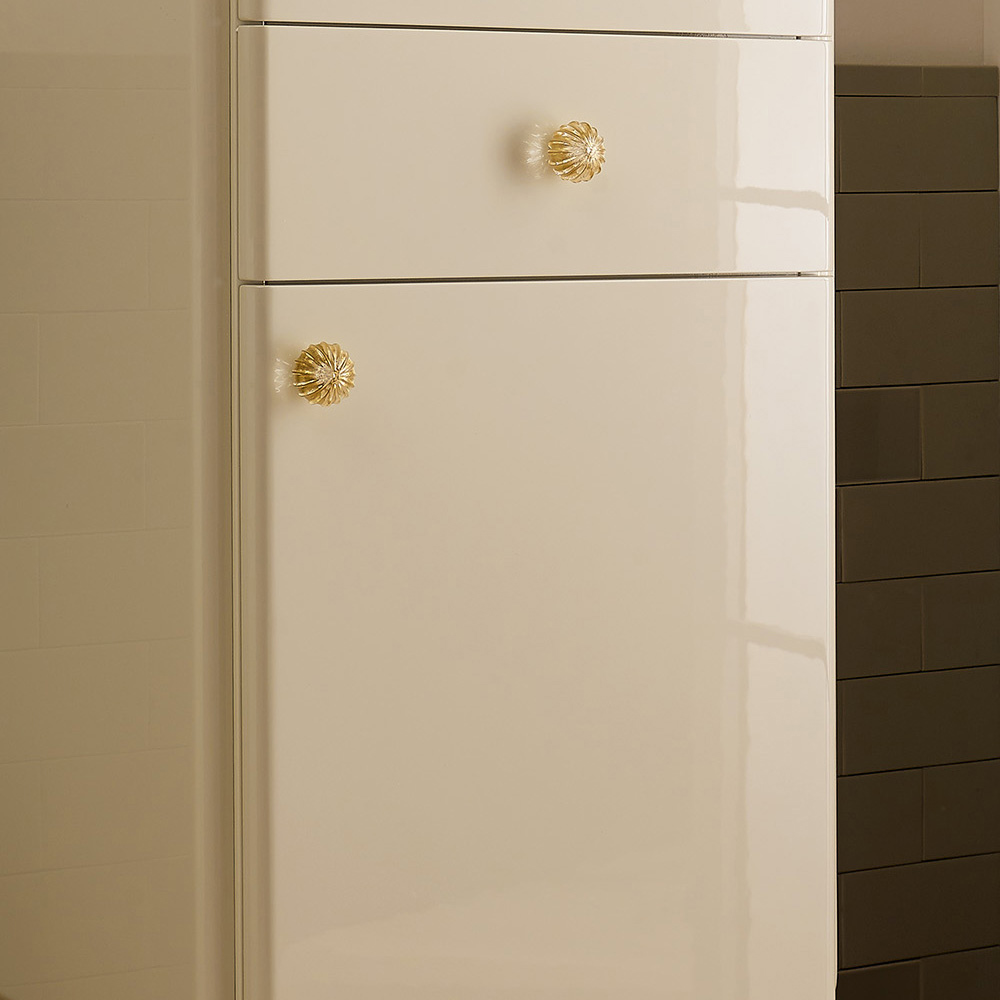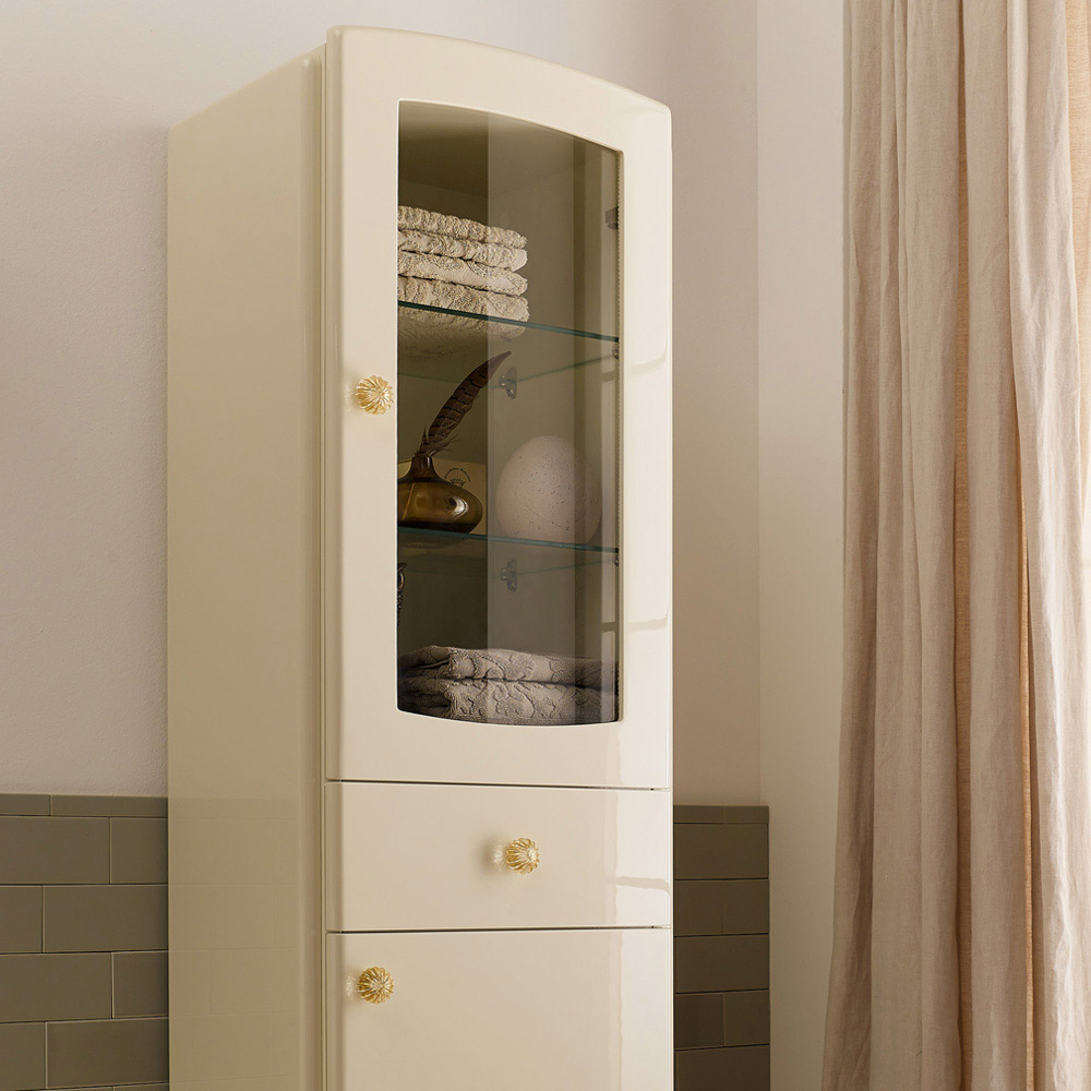 Vitrine h 180cmen MDF complète avec deux portes , dont une avec verre qui ferme 2 étagères en verre, et un tiroir au centre . La vitrine est en laqué brillant unicolore ivoire à l'extérieur et laqué mat à l'intérieur avec des boutons en laiton en forme de fleur dorée inclus.